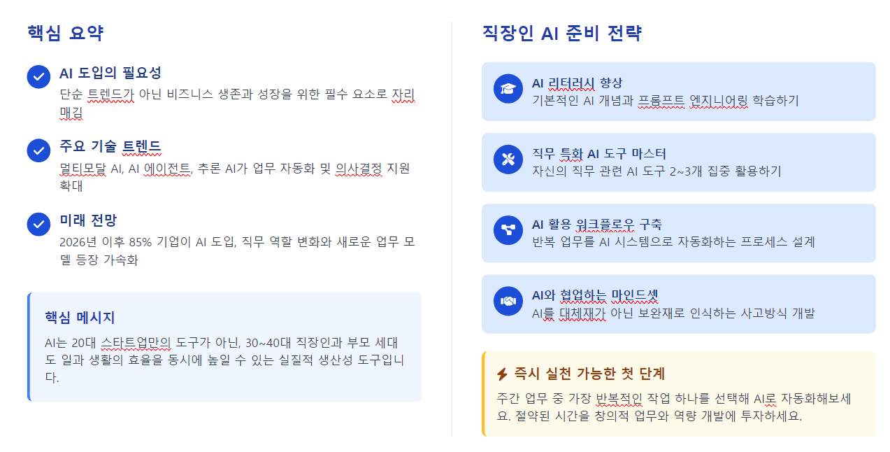 - AI는 생산성을 극적으로 높이는 현실적인 도구입니다: 보고서 작성, 기획, 콘텐츠 생성 등 다양한 업무에 AI를 활용해 시간을 단축할 수 있습니다.